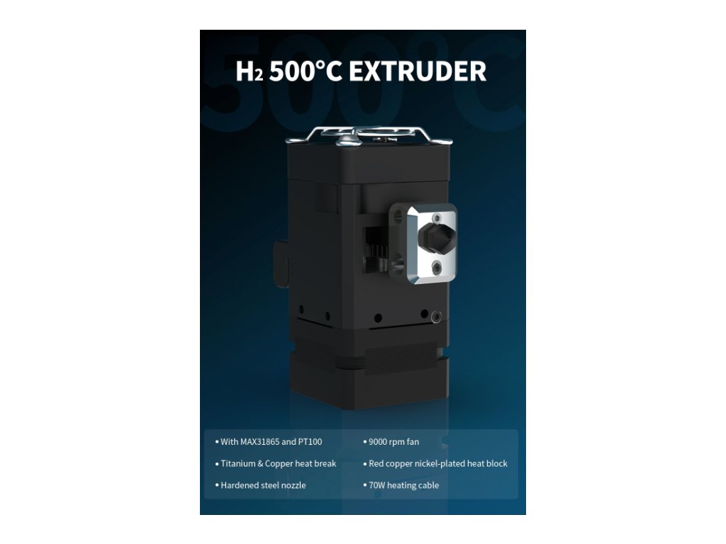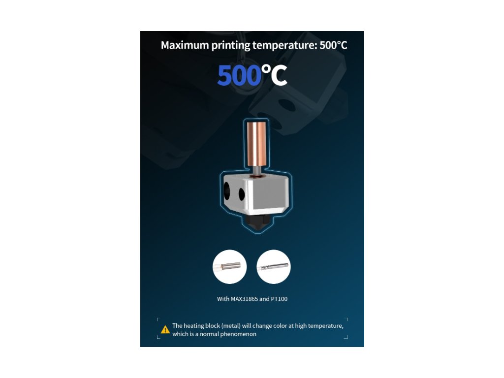 Verze 500℃ vychází z verze 2.0 s úpravami pro tisk při teplotě do 500℃. Vylepšeny heatbreak, heatblock, tryska, topné těleso a termistor.